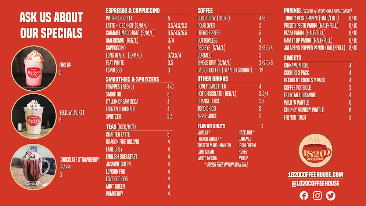 Welcome to 1820 Coffee House, your cozy sanctuary in Alvin, TX! Nestled at 419 W Sealy St, this charming venue offers an inviting atmosphere perfect for coffee enthusiasts and casual visitors alike. The menu boasts a delightful array of beverages and savory options, making it a go-to spot for any palate.